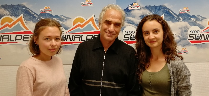 Photo : Mihaela, Madalina et Christian (accompagnateur) dans les studios de SunAlpes à Seynod.