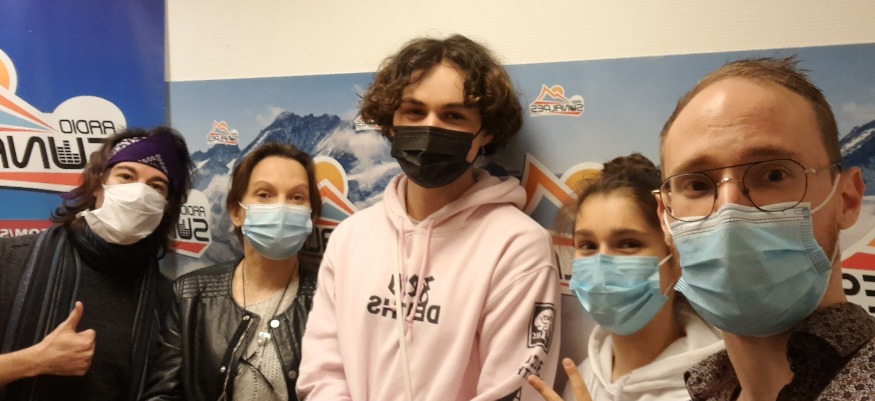 Photo : Maximilien (au centre) dans les studios de SunAlpes Radio.