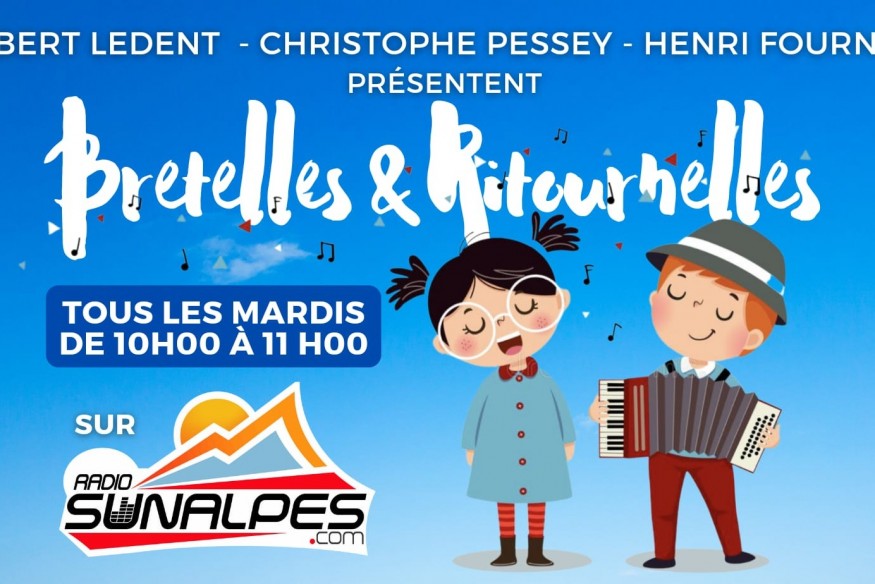 Le Mardi de 10H à 11H découvrez "Bretelles et Ritournelles" sur SunAlpes Radio, votre nouvelle émission de chansons françaises. 60 minutes avec Hubert Ledent, Christophe Pessey et Henri Fournier en chefs d'orchestre pour découvrir et re-découvrir la chanson Française dans une bonne humeur.