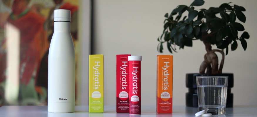 • une gourde Hydratis blanche de 500ml + 3 tubes Hydratis (pêche, citron fleur de sureau, fruits des bois).
