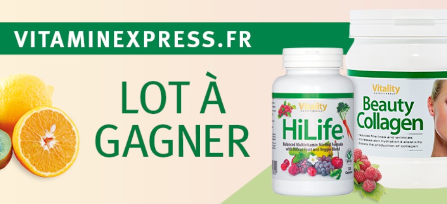 En ce moment tentez de gagner 2 produits phares de la gamme VitaminExpress : HiLife Multivitamines, pour renforcez votre système immunitaire avant l'hiver et Beauty Collagen pour gardez votre peau jeune et éclatante.