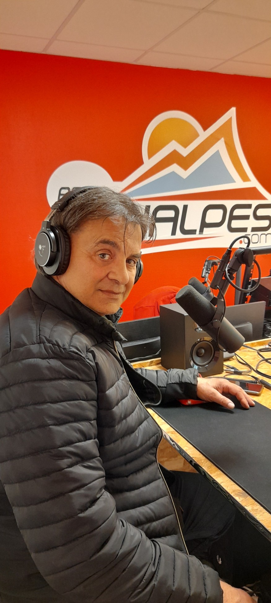 Photo : Dominique dans les studios de SunAlpes Radio.