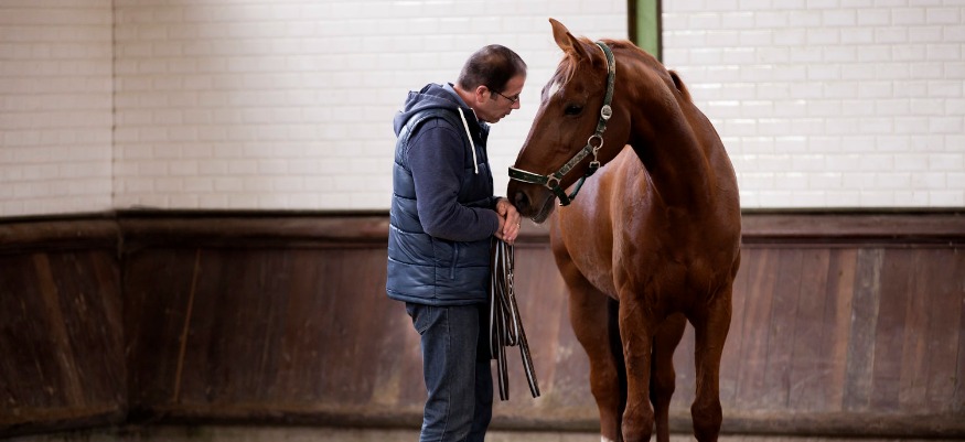 Photo : Guillaume ANTOINE, murmure quelques mots à l'oreille d'un cheval en séance de coaching.