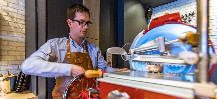 Photo : Maxime Merle, un passionné de gastronomie, aux commandes de sa trancheuse.