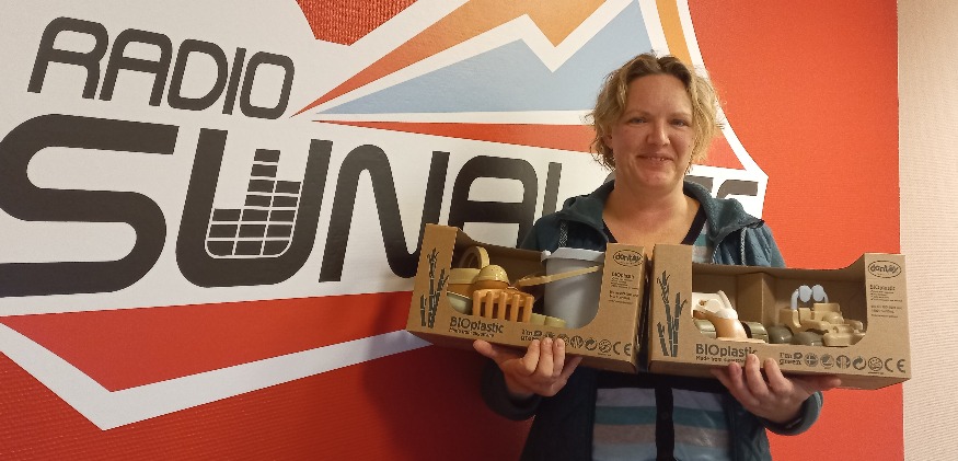 Photo : Ditte, avec dans les bras des jouets fabriqués à partir de résidus de canne à sucre.