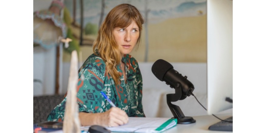 Photo : Violaine Capet pendant une interview radio.